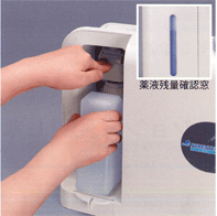 特長2.薬液ボトル一体型 薬液交換が簡単なワンタッチ式。 残量確認窓で 管理も容易 |